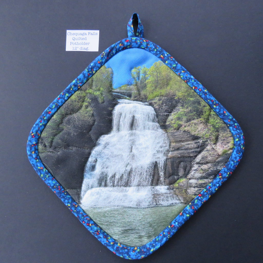 Chequaga Falls quilted potholder. Approximately 12 inches on the diagonal. Custom printed fabric from my photographs of Finger Lakes waterfalls. Designed and hand made in New York by Tracy Thomson of Kabuki Design Studio.