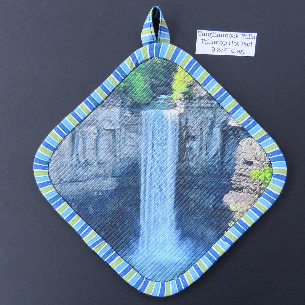 Taiughannock Falls tabletop hot pad. Approximately 9.75 inches on the diagonal. Custom printed fabric from my photographs of Finger Lakes waterfalls. Designed and hand made in New York by Tracy Thomson of Kabuki Design Studio.