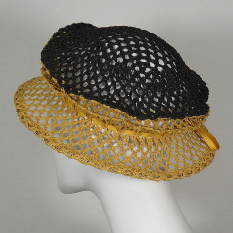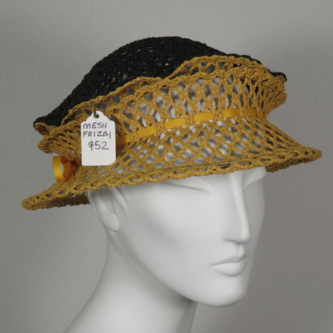 Frizbi, open mesh, gold brim and sides and black top.  11-inch diameter, 2.5-inch brim.  Adjustable size by adjusting the ribbon around the crown.  Packs flat for travel.  Designed and handcrafted in the USA by Tracy Thomson, Kabuki Design Studio.