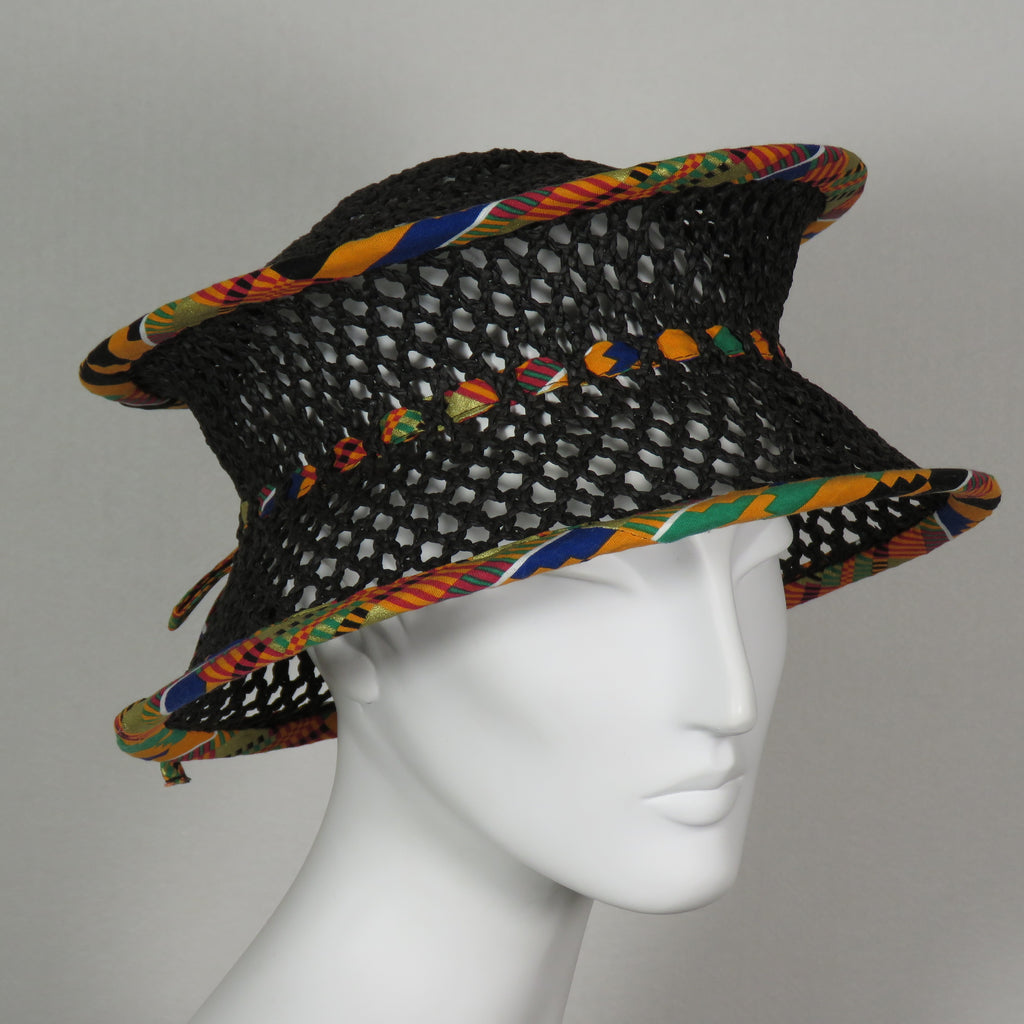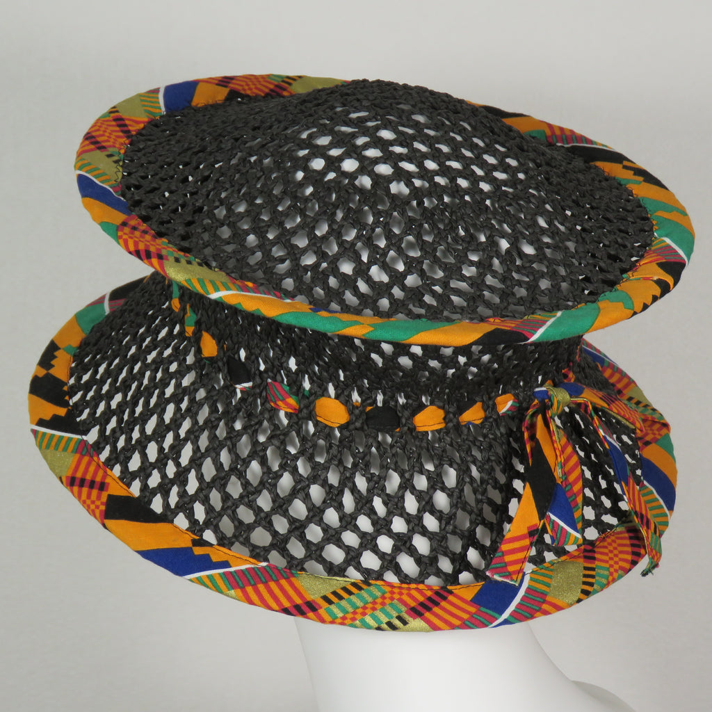 Kabuki po-up, black open mesh, kente print edges and bow. 11-inch diameter, 3-inch brim. Adjustable size by adjusting the ribbon around the crown. Packs flat for travel. Designed and handcrafted in the USA by Tracy Thomson, Kabuki Design Studio.