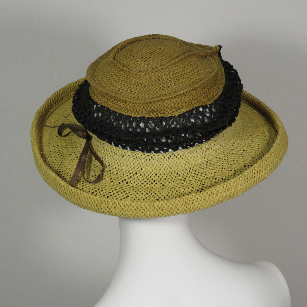 Lido, three-color neutral and black, open mesh, side. 13-inch diameter, 3.5-inch brim. Adjustable size by tightening the ribbon around the crown. Packs flat for travel. Designed and handcrafted in the USA by Tracy Thomson, Kabuki Design Studio.
