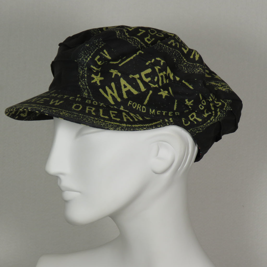 Kabuki meter print taxi cap, gold print on black cotton. Size large only.