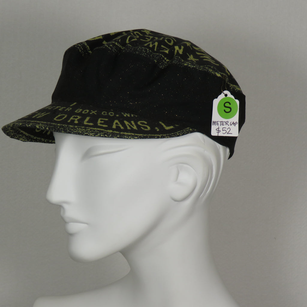 Kabuki meter print engineer cap, gold print on black cotton, black sparkly cotton side.  Size small only.