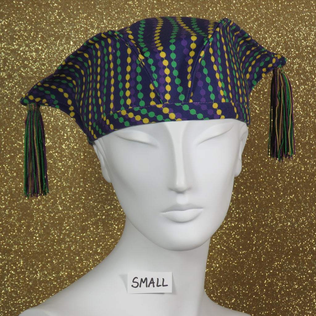 Kabuki Tri Fi, cotton Mardi Gras beads print on purple background and tassels.  Size small only.  Designed and hand crafted in the U.S. by Tracy Thomson of Kabuki Design Studio.
