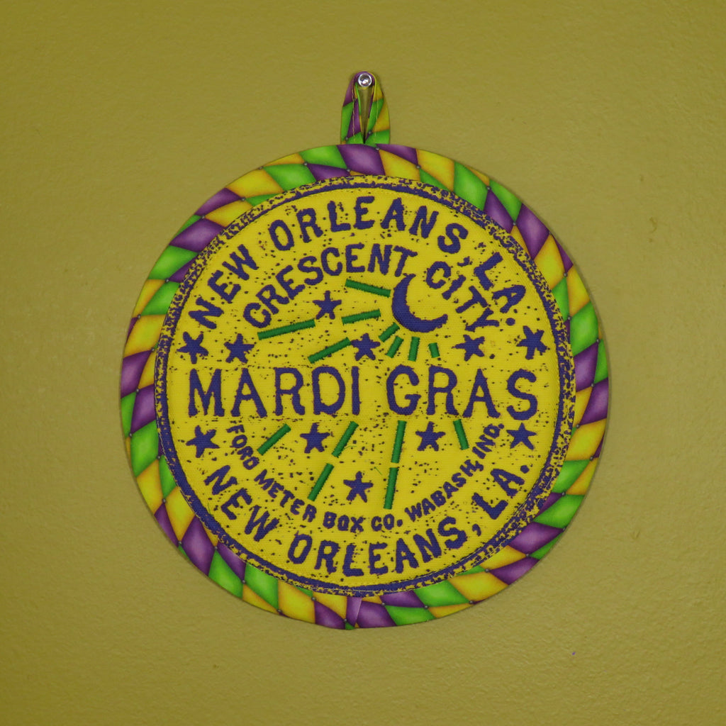 Potholder inspired by the iconic New Orleans Watermeter cover. Approximately ten inches in diameter. Designed and hand made in New York by Tracy Thomson of Kabuki Design Studio.