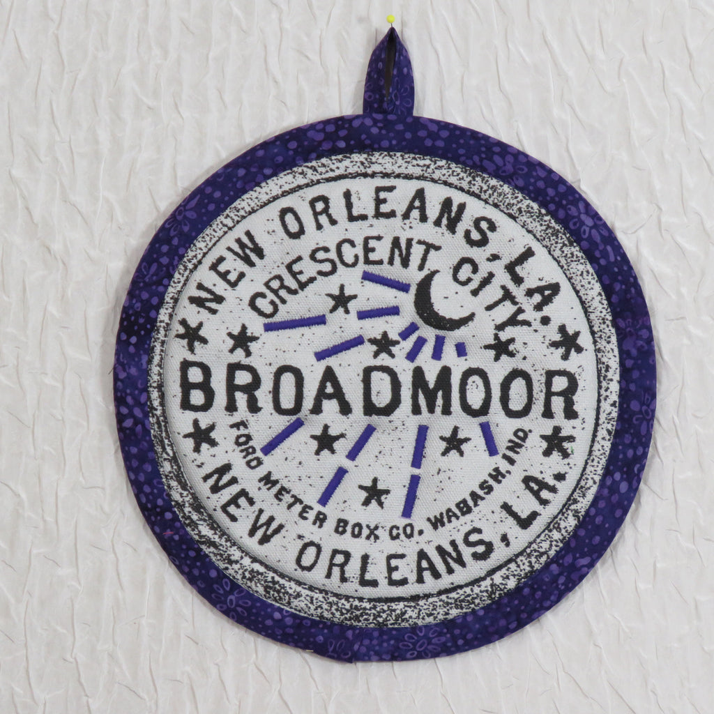 Potholder inspired by the iconic New Orleans Watermeter cover. Approximately ten inches in diameter. Designed and hand made in New York by Tracy Thomson of Kabuki Design Studio.