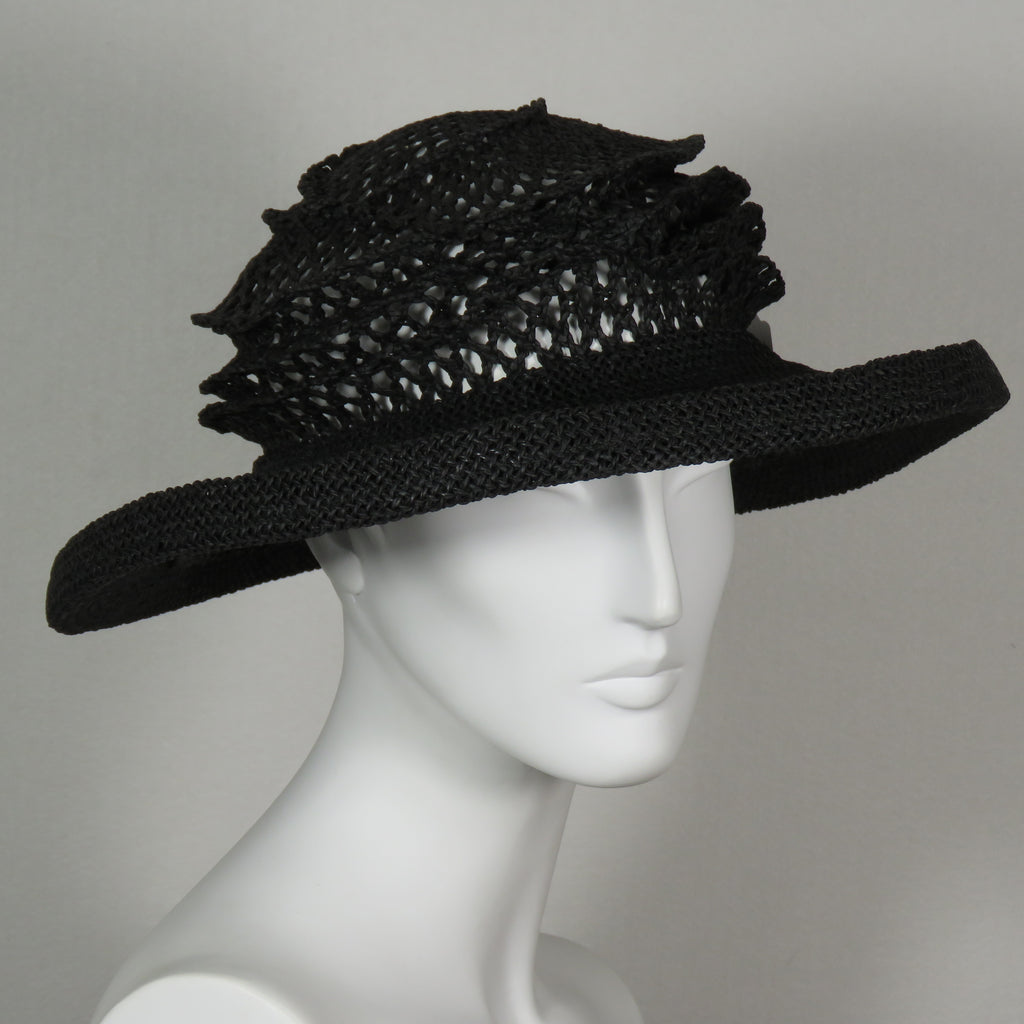Lido, black with open mesh crown. 14-inch diameter, 4-inch brim. Adjustable size by tightening the ribbon around the crown. Packs flat for travel. Designed and handcrafted in the USA by Tracy Thomson, Kabuki Design Studio.