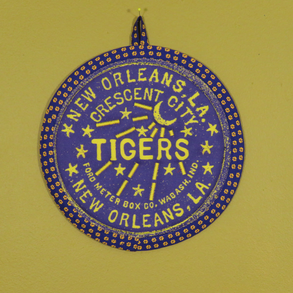 Potholder inspired by the iconic New Orleans Watermeter cover. Approximately ten inches in diameter. Designed and hand made in New York by Tracy Thomson of Kabuki Design Studio.