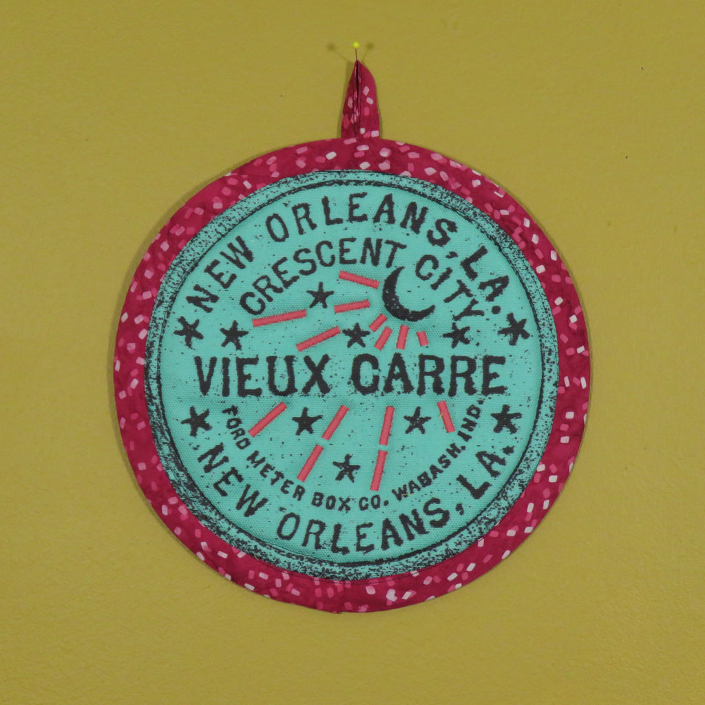 Potholder inspired by the iconic New Orleans Watermeter cover. Approximately ten inches in diameter. Designed and hand made in New York by Tracy Thomson of Kabuki Design Studio.