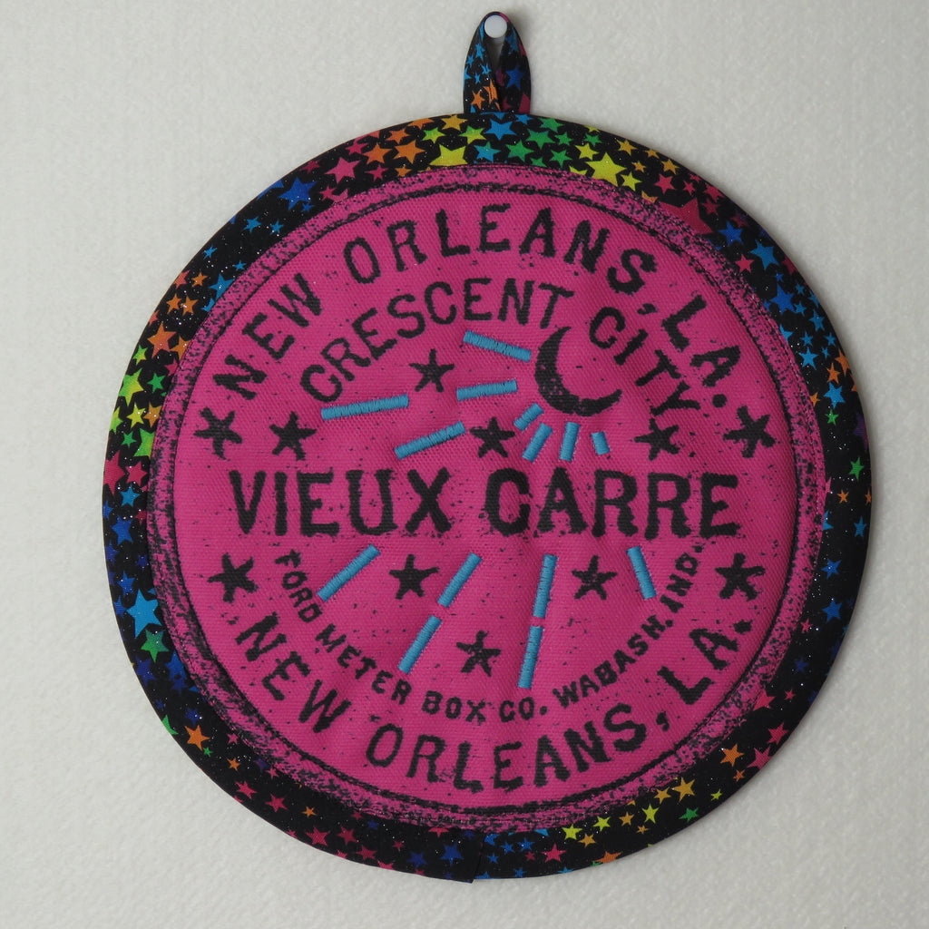 Potholder inspired by the iconic New Orleans Watermeter cover. Approximately ten inches in diameter. Designed and hand made in New York by Tracy Thomson of Kabuki Design Studio.