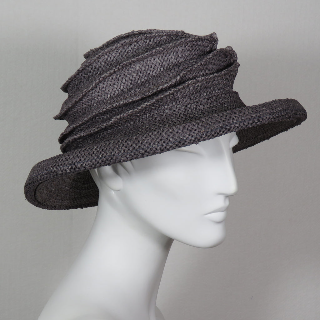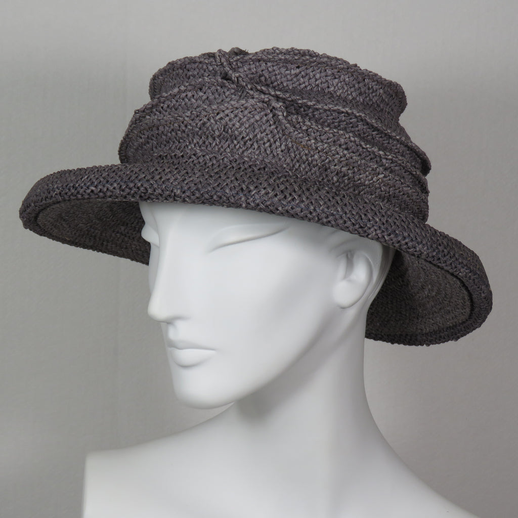 Lido, Grey Denim. 12.5-inch diameter, 3-inch brim. Adjustable size by tightening the ribbon around the crown. Packs flat for travel. Designed and handcrafted in the USA by Tracy Thomson, Kabuki Design Studio.