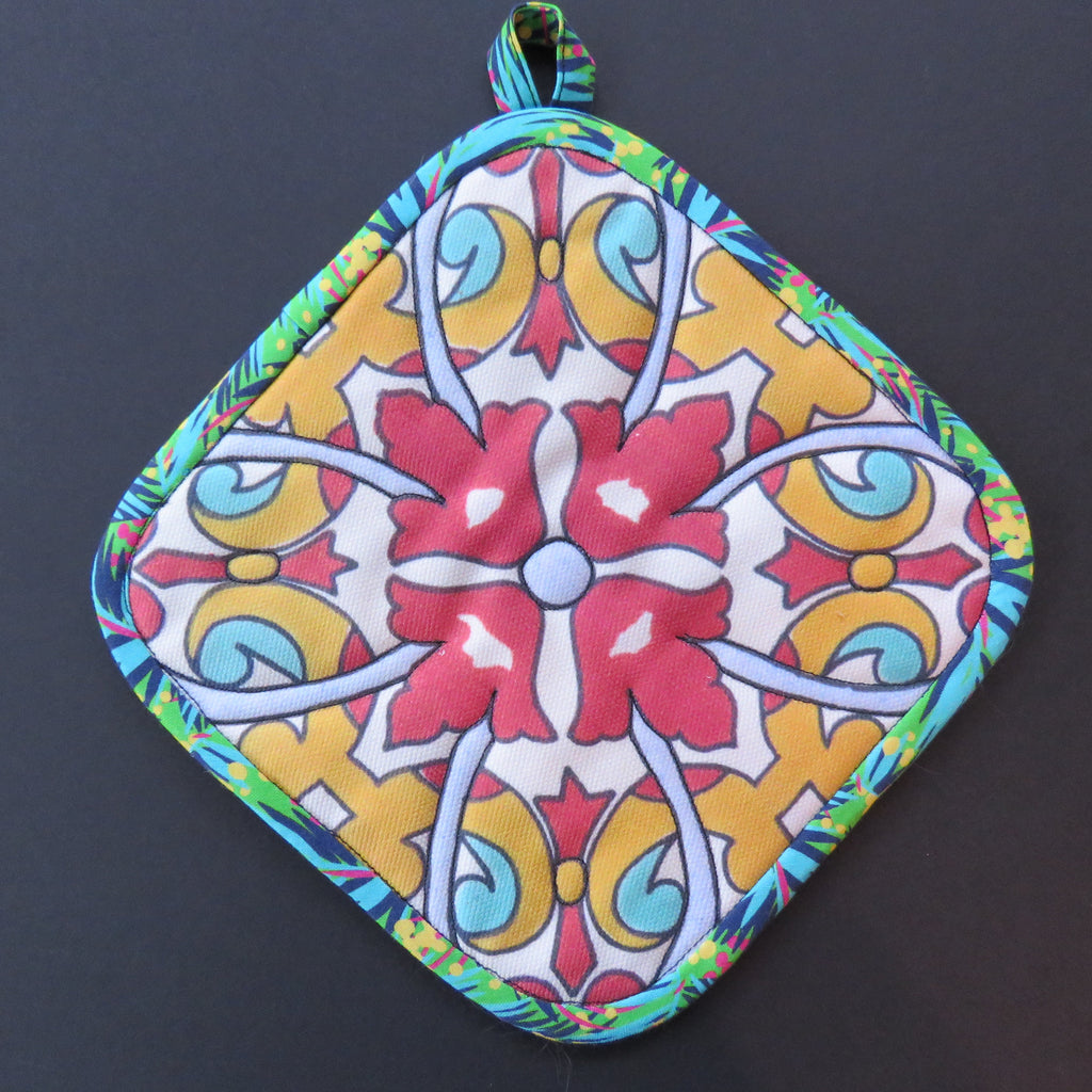 Talavera tile print potholder. Approximately eight inches square. Designed and hand made in New York by Tracy Thomson of Kabuki Design Studio.