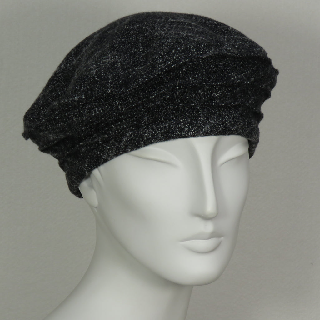 Kabuki Beret, charcoal cotton tweed with grey highlights. Size large only. Designed and hand crafted in the U.S. by Tracy Thomson of Kabuki Design Studio.
