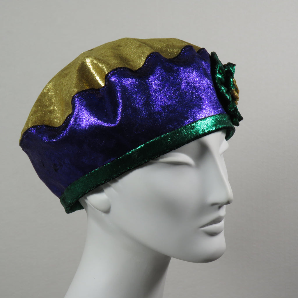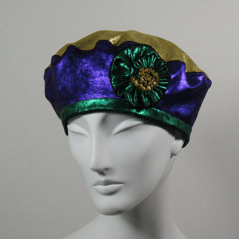 Kabuki beret, purple, green and gold embossed velvet with a fabric flower. Size medium only. Designed and hand crafted in the U.S. by Tracy Thomson of Kabuki Design Studio.