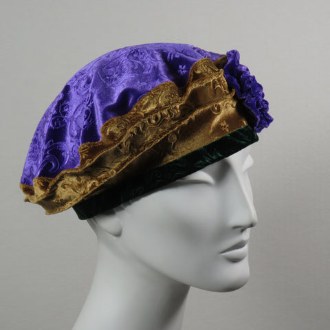 Kabuki Beret, Purple Green and Gold Embossed Velvet, Flower, Size Small