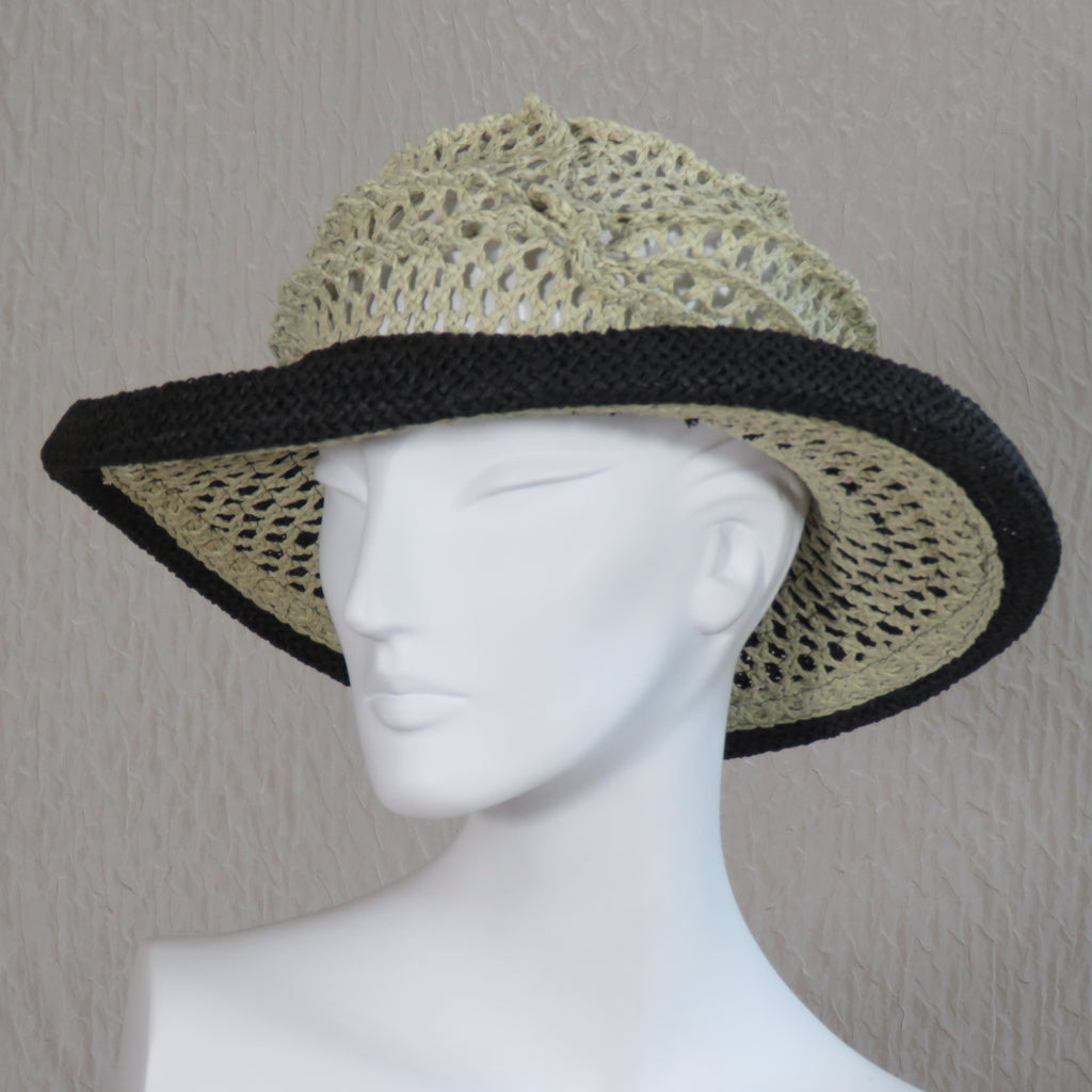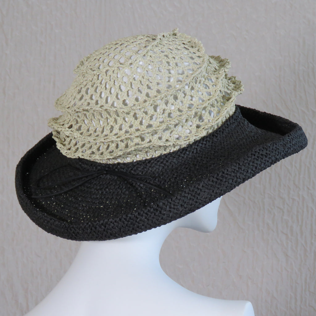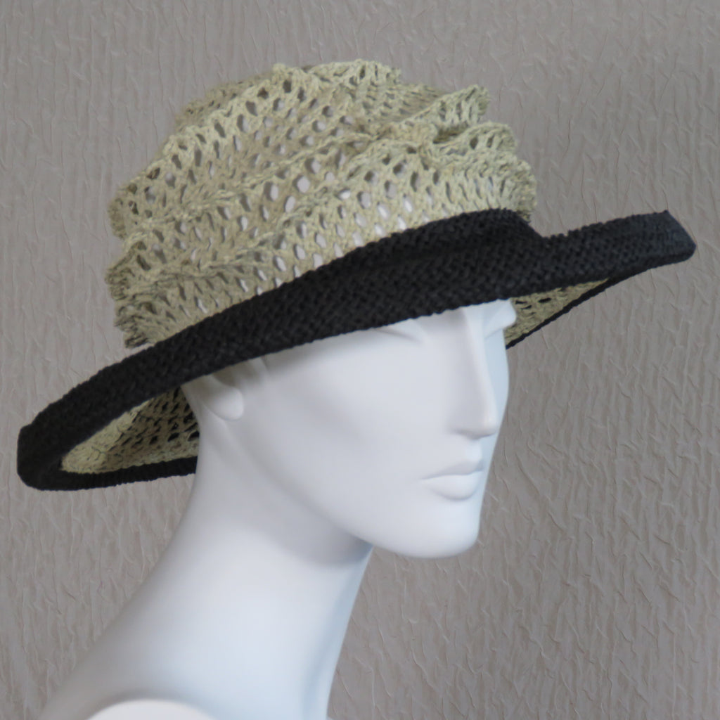 Lido, black brim and beige crown. 13-inch diameter, 3.5-inch brim. Adjustable size by tightening the cord around the crown. Packs flat for travel. Designed and handcrafted in the USA by Tracy Thomson, Kabuki Design Studio.