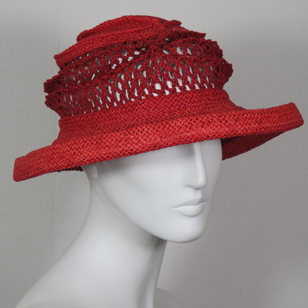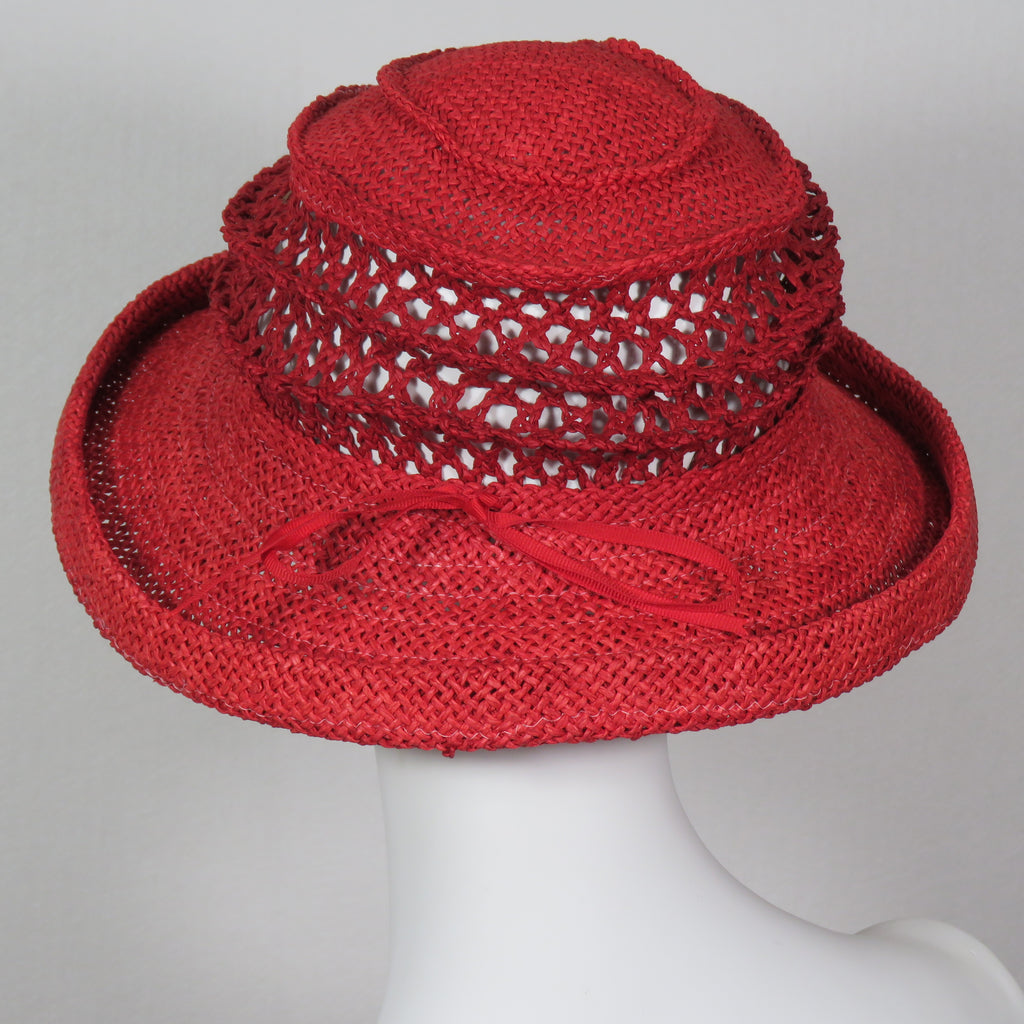 Lido, Red with open mesh side. 11.5-inch diameter, 3-inch brim. Size small only. Adjustable size by tightening the cord around the crown. Packs flat for travel. Designed and handcrafted in the USA by Tracy Thomson, Kabuki Design Studio.