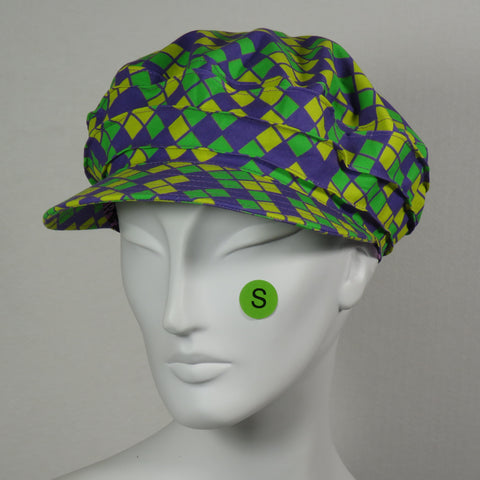 Kabuki taxi cap, purple, green and gold Mardi Gras print. Size small (22 inch circumference) only.