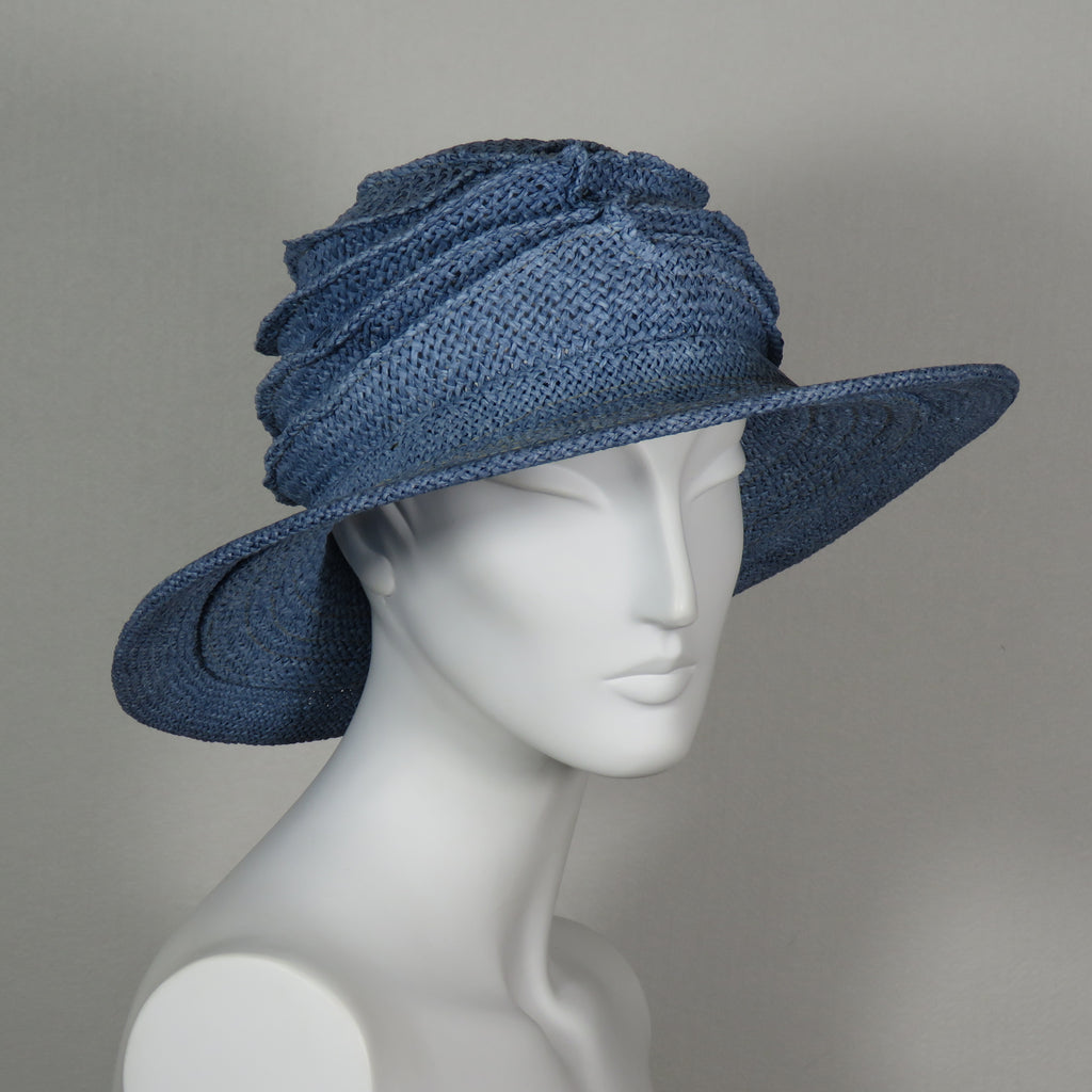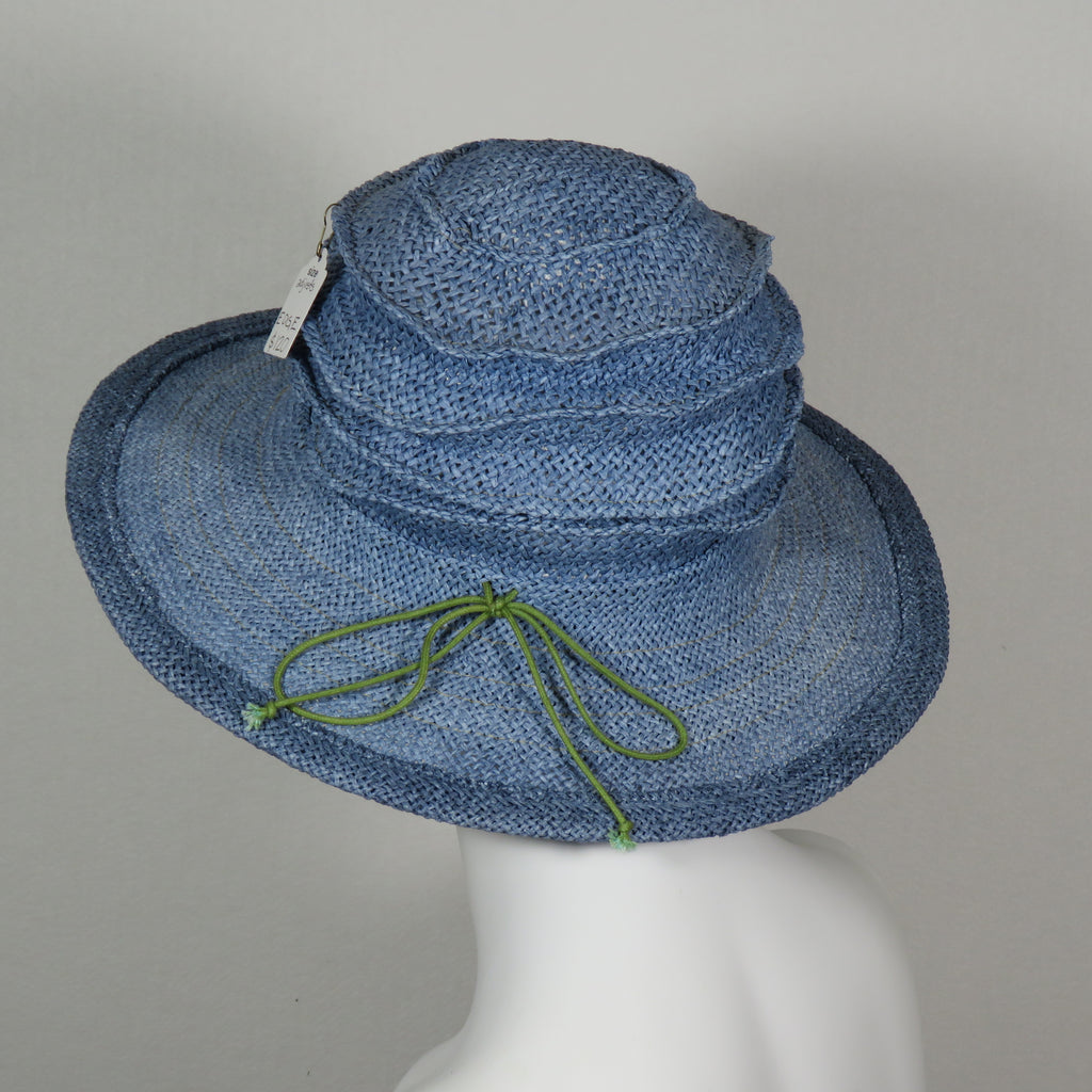 Wired, denim with deep crown. 15-inch diameter, 5-inch brim. Adjustable size by re-tying the ribbon around the crown. Packs flat for travel. Designed and handcrafted in the USA by Tracy Thomson, Kabuki Design Studio.